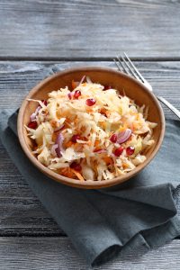 - In a large bowl, combine apples, sauerkraut, greens, onion, nuts/seeds, and cranberries.