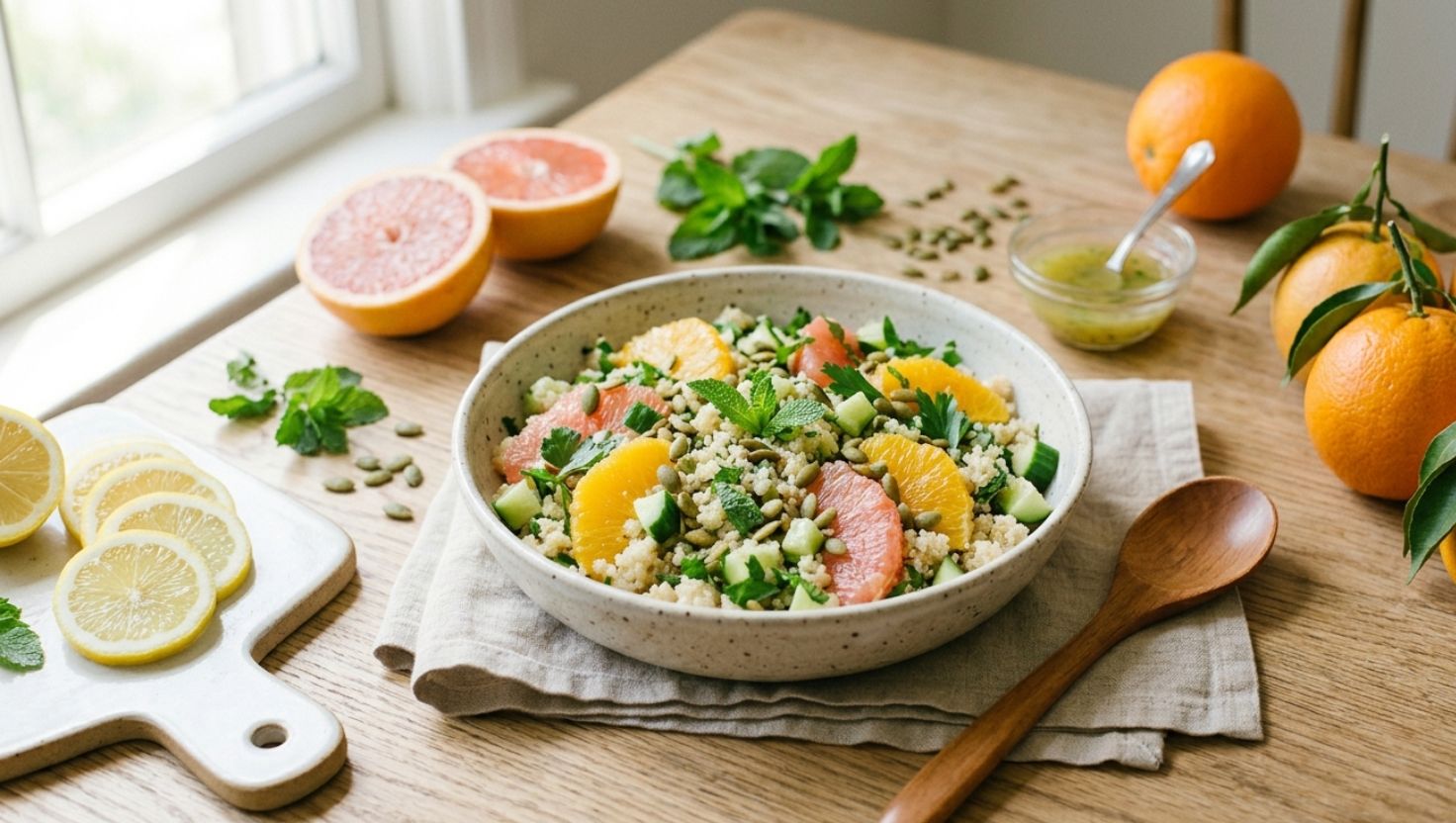 This salad combines several ingredients that naturally complement one another from both a nutritional and energetic perspective. Quinoa provides plant-based protein and important minerals such as magnesium and iron, helping sustain energy without heaviness. Citrus fruits offer hydration, vitamin C, and a bright sour note often associated in traditional wellness systems with supporting internal balance during spring. Fresh mint contributes cooling properties that may help calm digestive discomfort and refresh the body after meals.